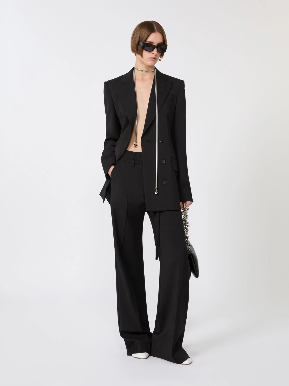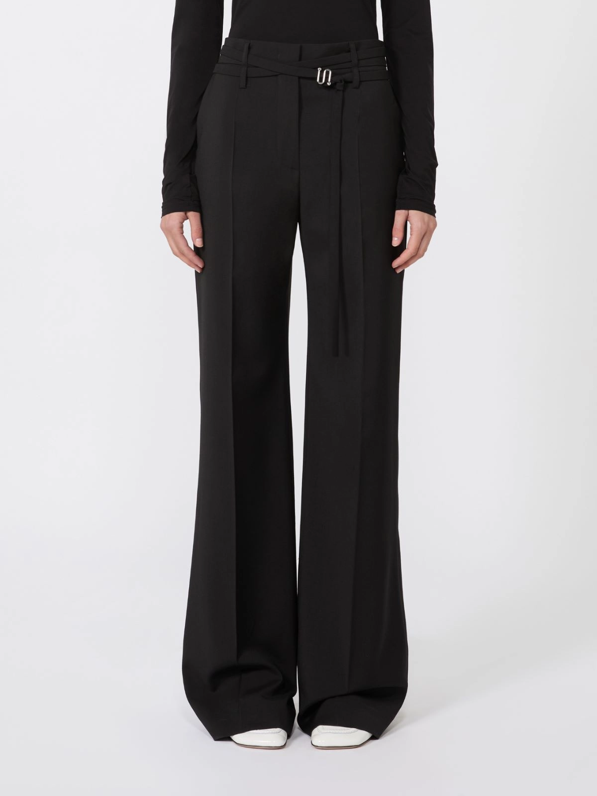 Low-rise flared trousers with tailored construction and customised internal waistband. The style features a double-wrap belt at the waist and a metal S-buckle, an iconic element of the collection.